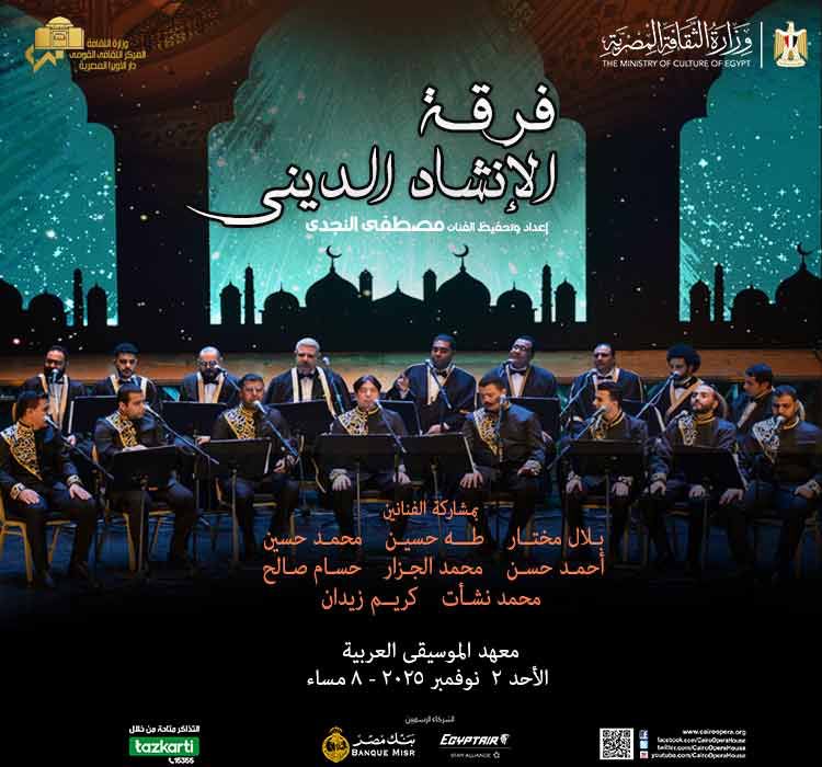 أمسية نورانية تأتى ضمن خطوات وزارة الثقافة لصون التراث الروحانى تقيمها دار الأوبرا المصرية برئاسة الدكتور علاء عبد السلام لفرقة الإنشاد الدينى وذلك فى الثامنة مساء الأحد 2 نوفمبر على مسرح معهد الموسيقى العربية .