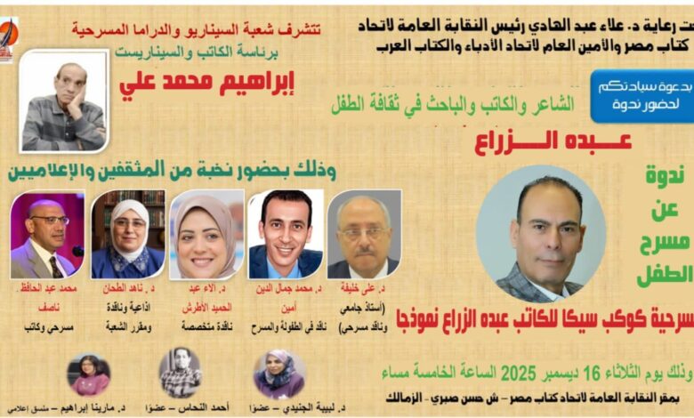 تحت رعاية الدكتور علاء عبد الهادي رئيس النقابة العامة لاتحاد كتاب مصر، والأمين العام لاتحاد الأدباء والكتاب العرب، تستضيف النقابة العامة لاتحاد كتاب مصر ندوة متخصصة حول مسرح الطفل، وذلك يوم الثلاثاء 16 ديسمبر 2025 في تمام الساعة الخامسة مساءً، بمقر النقابة العامة لاتحاد كتاب مصر في شارع حسن صبري – الزمالك.