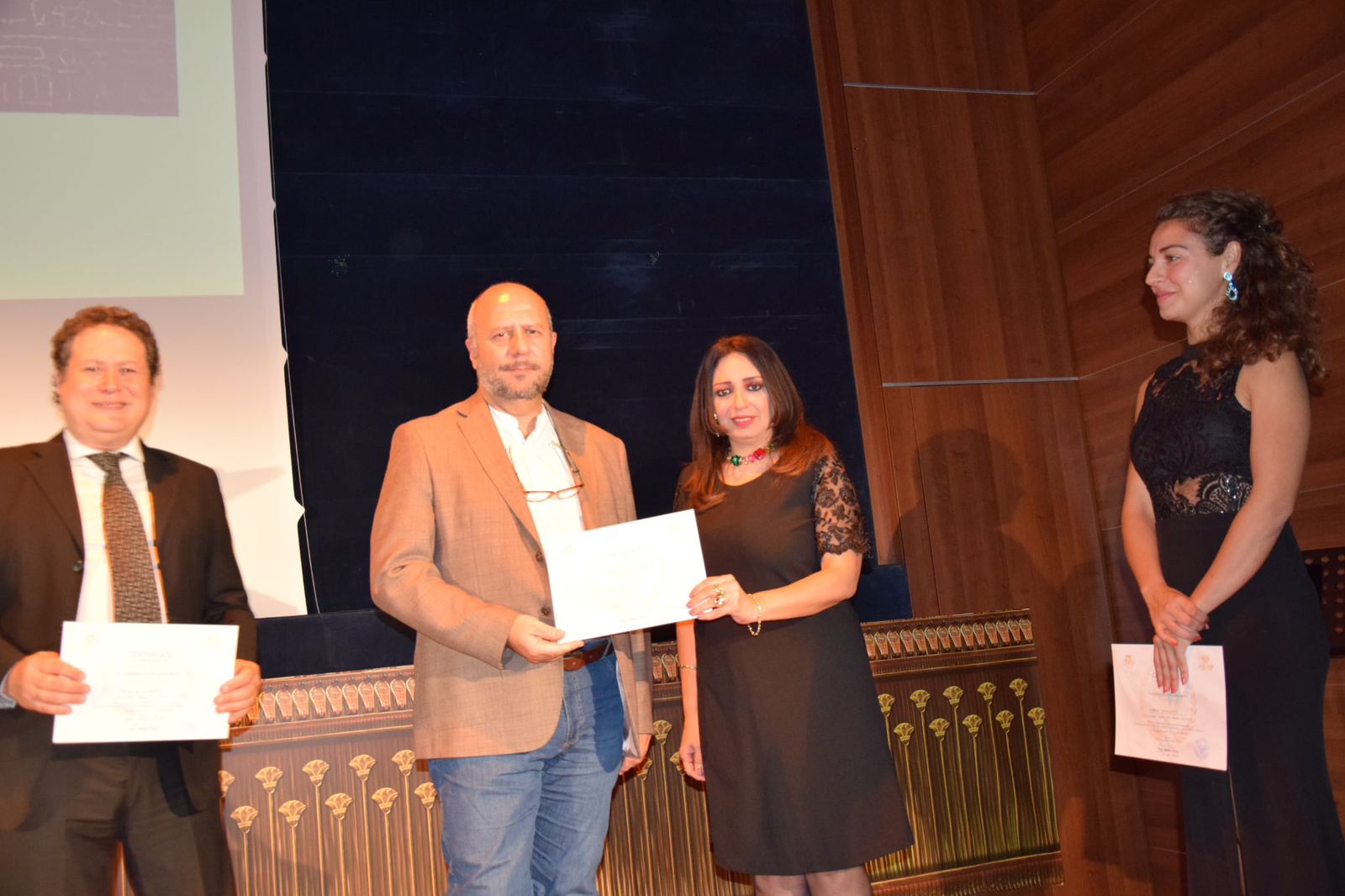 واختُتمت الأمسية بقيام الأستاذة الدكتورة رانيا يحيى بتقديم شهادات تقدير لكل من الأستاذ الدكتور إيمانويل شامبيني، والمايسترو باولو شيبيليا، والسوبرانو جوليا ليبوري، تقديرًا لمشاركتهم القيّمة في هذه الأمسية الثقافية والفنية الرفيعة.