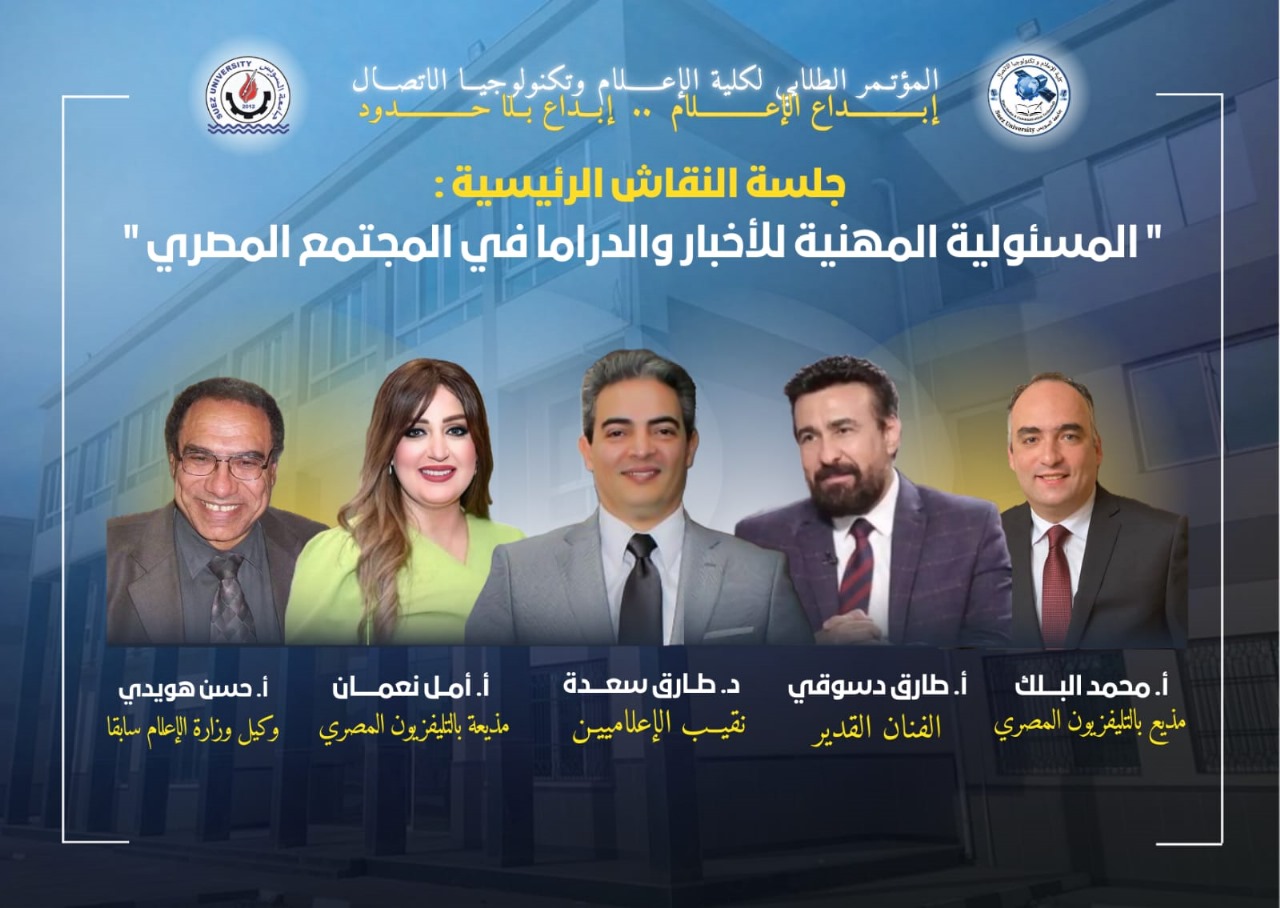 ويشهد المؤتمر جلسة نقاشية رئيسية بعنوان: “المسؤولية المهنية للأخبار والدراما في المجتمع المصري”، يشارك فيها نخبة من الإعلاميين والفنانين والمتخصصين، من بينهم: الدكتور طارق سعدة نقيب الإعلاميين والفنان القدير طارق دسوقي والإعلامية القديرة أمل نعمان والإعلامي القدير محمد البلك مذيع قناة النيل للأخبار والإعلامي حسن هويدي وكيل وزارة الإعلام الأسبق .