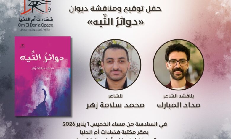 يستهل صالون فضاءات أم الدنيا الثقافي، بوسط القاهرة، نشاطه للعام 2026 ، في تمام السادسة من مساء الخميس 1 يناير، بتوقيع ومناقشة ديوان “دوائر التيه” للشاعر محمد سلامة زهر.