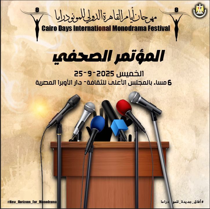 تحت رعاية الدكتور أحمد فؤاد هنو وزير الثقافة، يعقد مهرجان القاهرة الدولي للمونودراما برئاسة الدكتور أسامة رؤوف، مؤتمرا صحفياً لإعلان تفاصيل الدورة الثامنة، وذلك فى الخامسة من مساء يوم الخميس المقبل 25 سبتمبر، بالمجلس الأعلى للثقافة بدار الأوبرا المصرية.