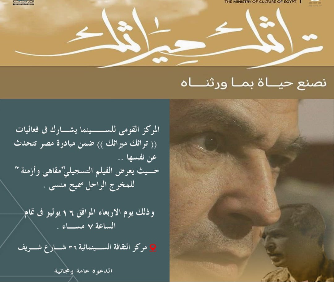 في إطار مبادرة وزارة الثقافة “مصر تتحدث عن نفسها”، يشارك المركز القومي للسينما برئاسة الدكتور أحمد صالح في فعاليات محور “تراثك ميراثك” بعرض الفيلم التسجيلي “مقاهي وأزمنة”.