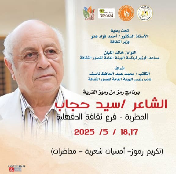 تحتفي الهيئة العامة لقصور الثقافة، برئاسة اللواء خالد اللبان، اليوم السبت، بشاعر العامية الكبير سيد حجاب، ضمن برنامجها الثقافي “رمز من رموز القرية”، المعني بتكريم الشخصيات المؤثرة التي أثرت المشهد الثقافي والفكري في مصر، في إطار أنشطة وزارة الثقافة.