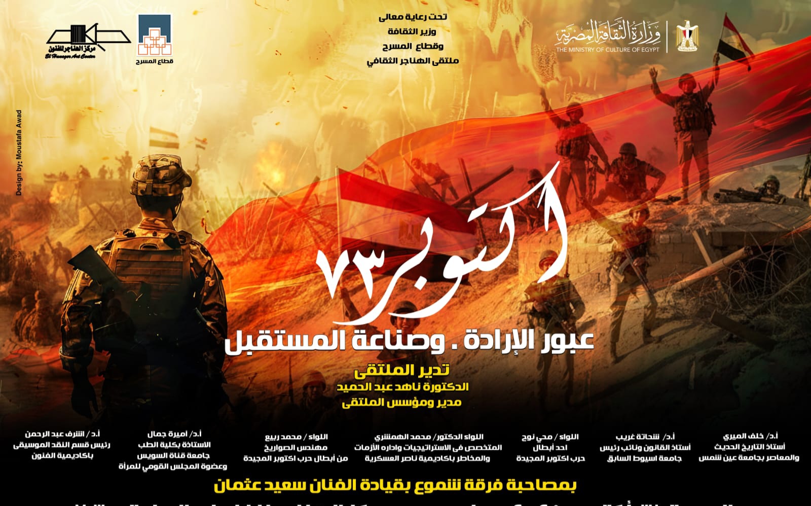 ضمن فعاليات وزارة الثقافة للاحتفال بذكرى نصر أكتوبر المجيد، يناقش قطاع المسرح برئاسة المخرج هشام عطوة، 7 محاور رئيسية فى ملتقى الهناجر الثقافي الذى يأتى هذا الشهر بعنوان “أكتوبر 73 عبور الإرادة وصناعة المستقبل” وذلك فى السابعة من مساء يوم الأحد 9 نوفمبر الجاري بمركز الهناجر للفنون برئاسة الفنان شادي سرور .